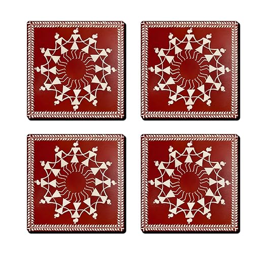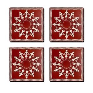 Beautiful Aipan art tea coasters inspired by traditional Kumaoni folk designs. These handcrafted coasters feature elegant white patterns on a vibrant red background, adding a cultural and artistic touch to your tea table.